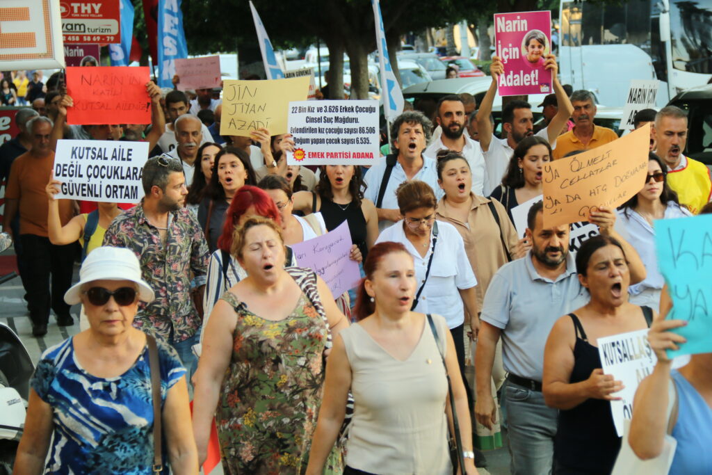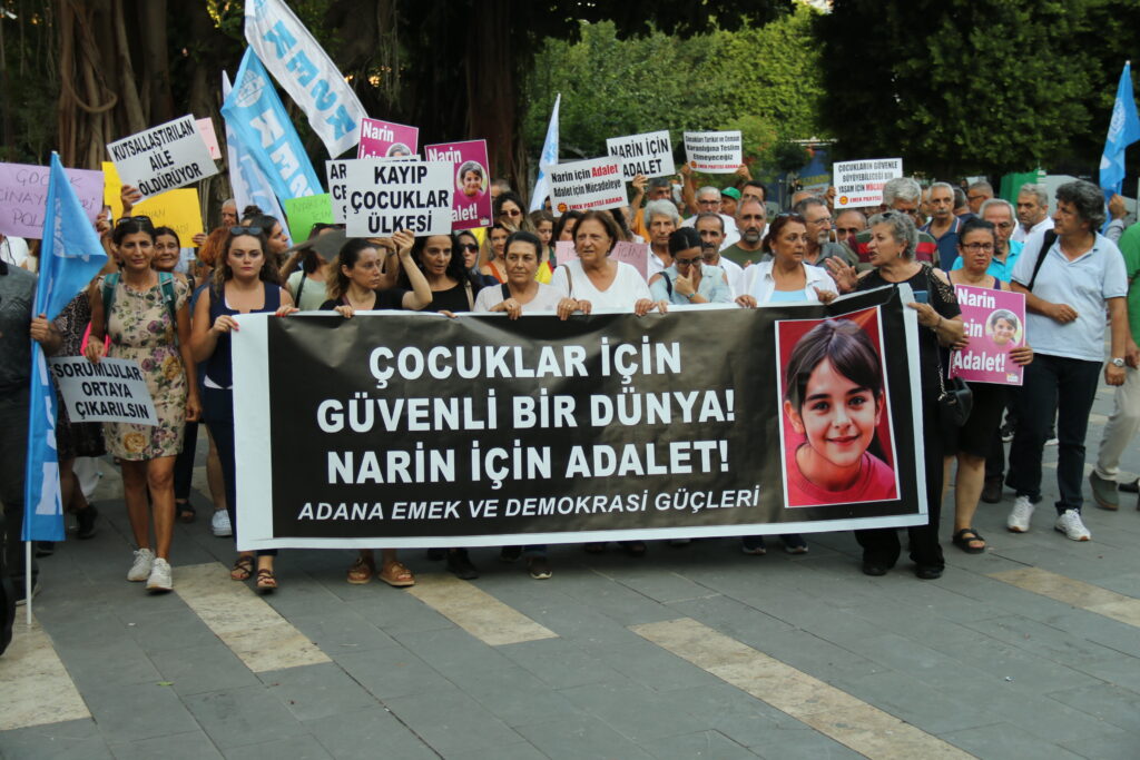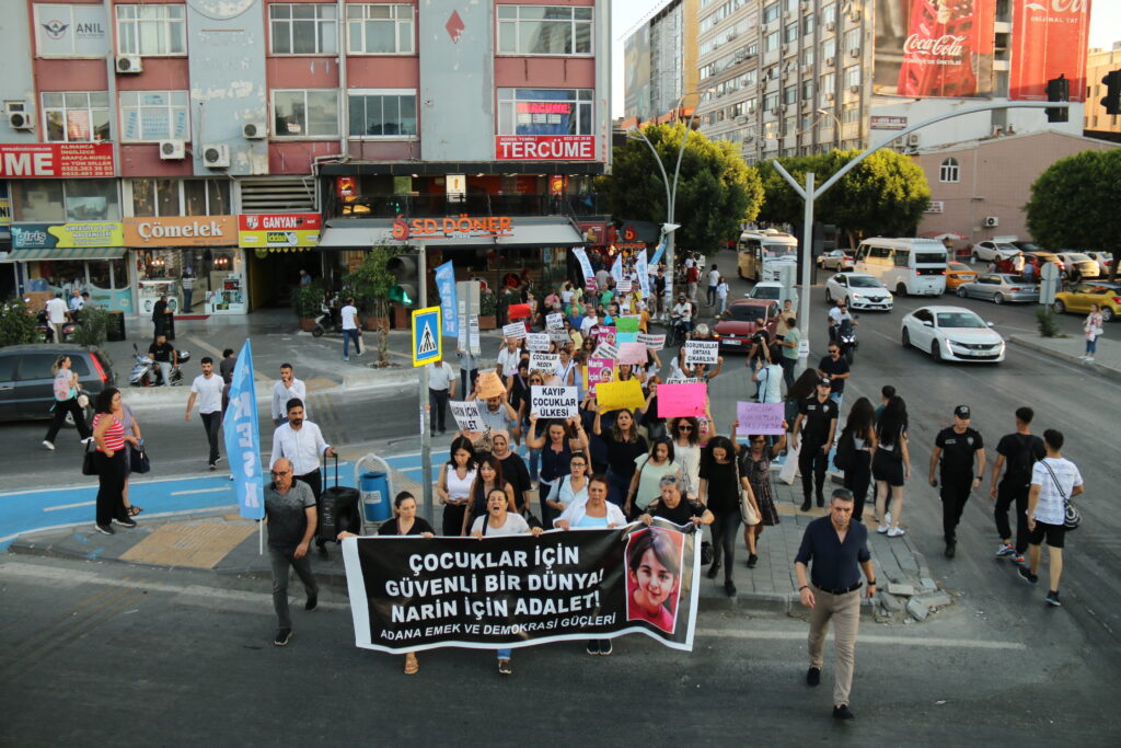 Adalet talebinde bulunmak için İnönü Parkı’nda toplanan kitle ellerinde “Narin için Adalet, Adalet için Mücadeleye”, “Narin’in faillerini koruma, aklama, yargıla” ve “Çocukları tarikat cemaat karanlığına teslim etmeyeceğiz” yazılı dövizlerle Atatürk Parkı’na kadar yürüdü.