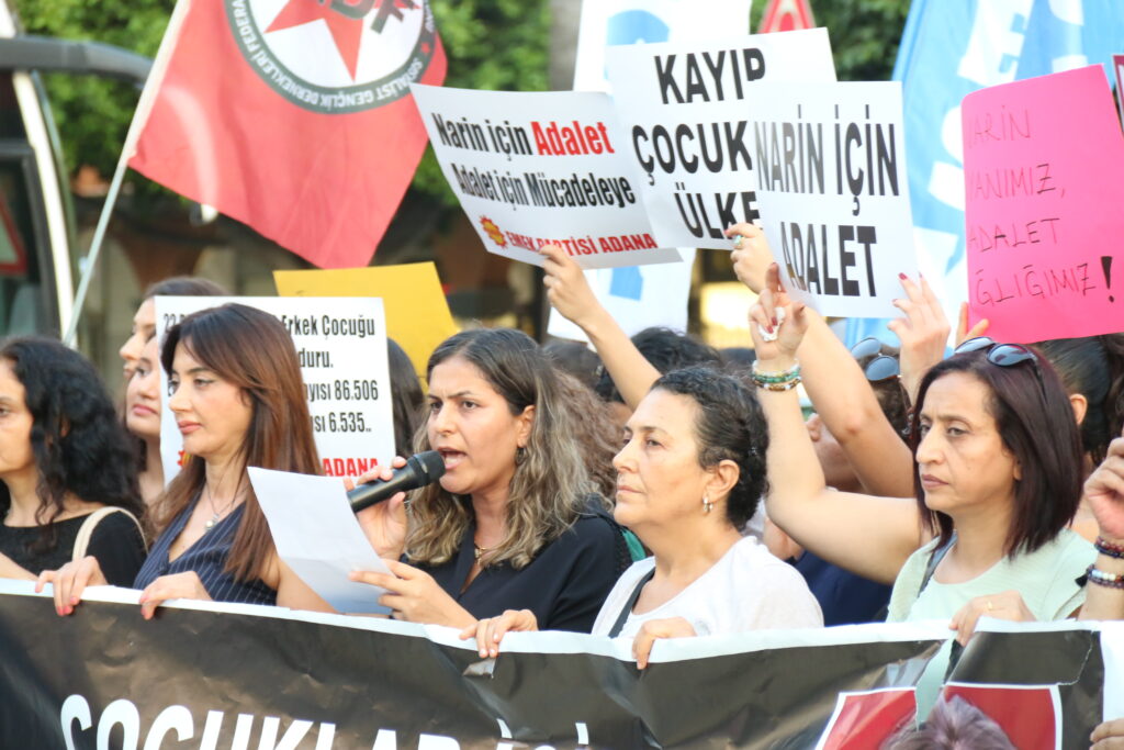 Atatürk Parkı’nda gerçekleştirilen basın açıklamasını DEM Parti Adana İl Eşbaşkanı Helin Kaya okudu. Narin’in ölümü münferit değil, organize bir cinayet” dedi.Narin için adalet sağlanana kadar mücadele edeceğiz” dedi.