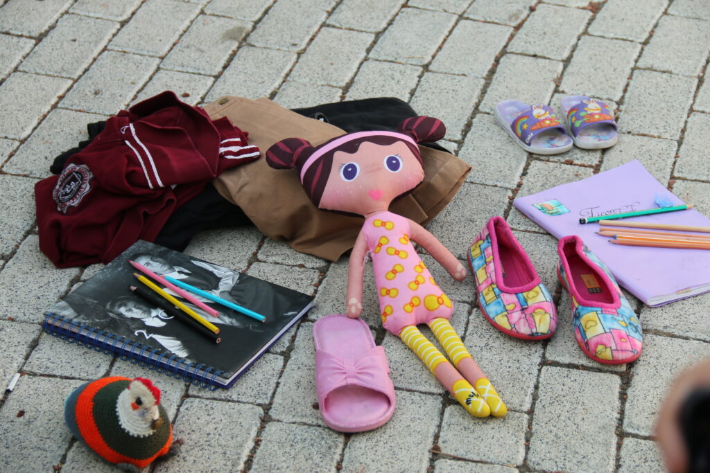 Açıklama sırasında kadınlar, yere serdikleri oyuncak, terlik, ayakkabı, çanta, önlük, kalem ve defterlerle eğitim ile yaşam hakkı ihlal edilen çocukların durumuna dikkat çekti.