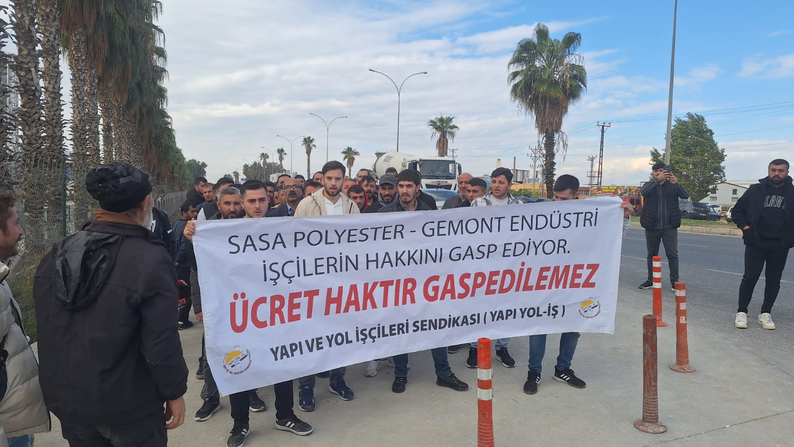 SASA Polyester ve Gemont Endüstri’nde çalışan Yapı ve Yol İşçileri Sendikası üyesi 670 işçi, 2 aylık maaşlarını ve tazminatlarını alamadıkları gerekçesiyle iş bıraktı. Yapı Fabrika önünde bir araya gelen işçiler, gasp edilen haklarının bir an önce verilmesini istedi. İşçiler, talepleri karşılana kadar mücadele edeceklerini kaydeden işçiler, tüm kesimleri eylemlerine destek vermeye çağırdı.