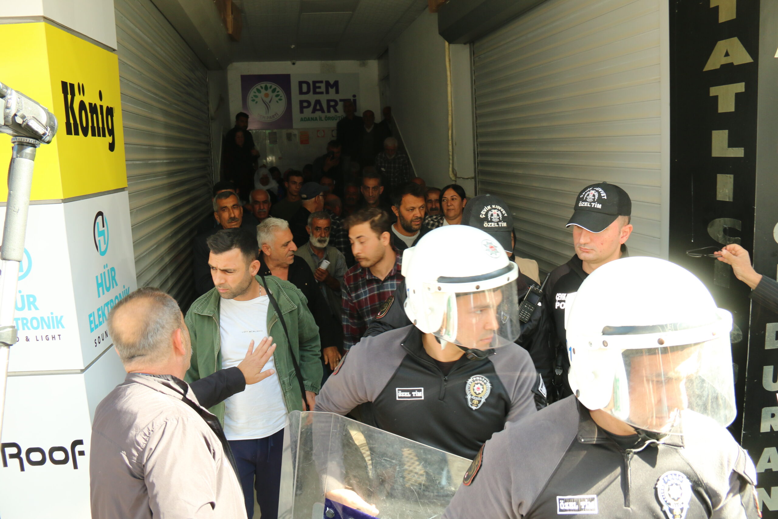 Adana’da DEM Parti Adana İl Örgütü’nün İnönü Parkı’nda yapmak istediği açıklamaya polis izin vermezken, binalarının önünde yaptıkları açıklama ile “iktidarın saldırgan politikalarını” protesto etti.
