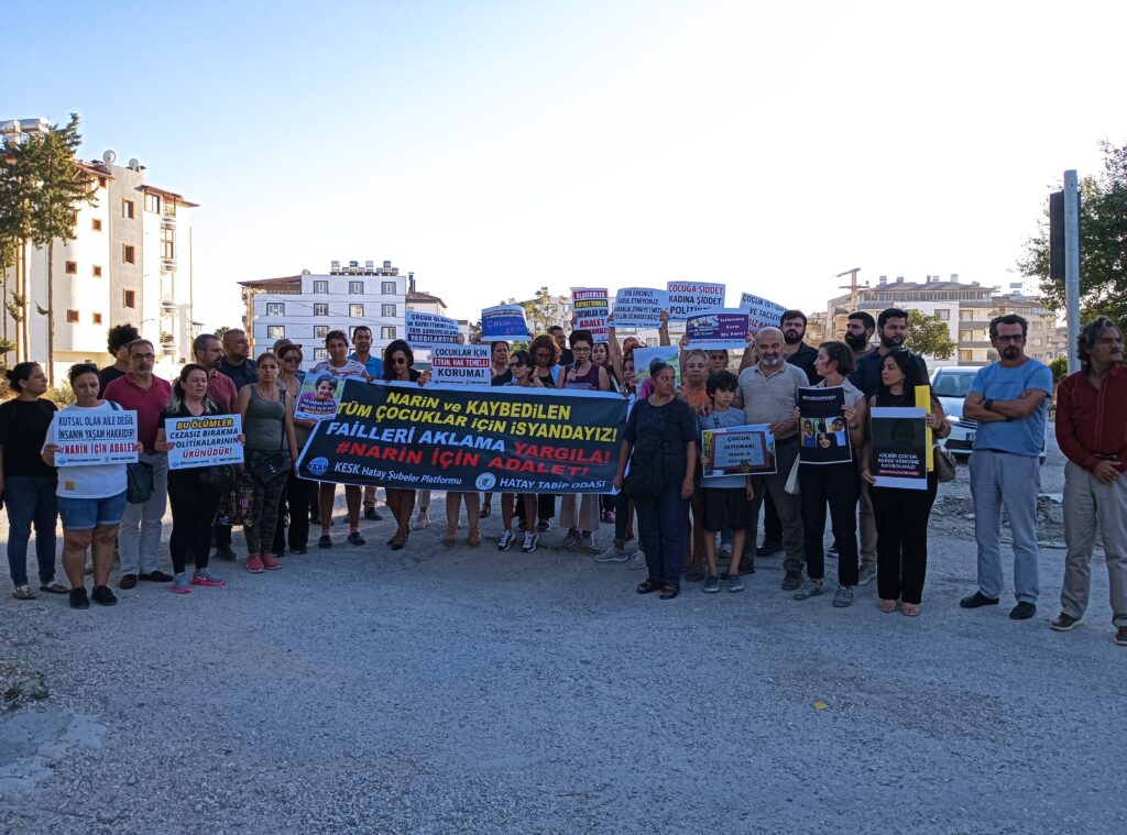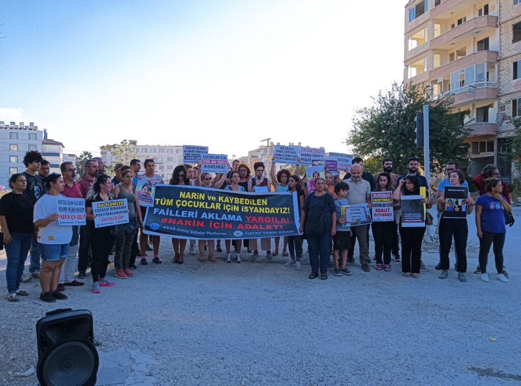 Hatay’ın Antakya ilçesinde de KESK ve TTB’nin çağrısıyla Antakya Akdeniz Işıkları’nda bir araya gelen kitle Narin için adalet talep etti.