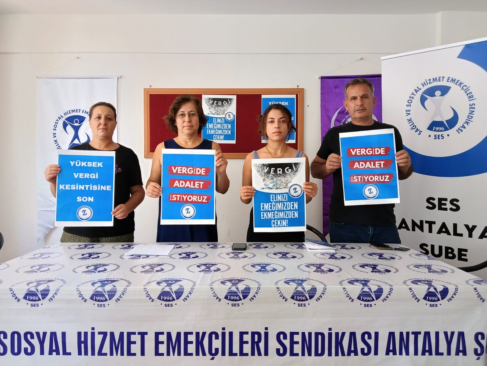 Sağlık emekçilerinin başlattığı “Vergide Adalet” eylemi 27’nci haftasına girdi. Sağlık ve Sosyal Hizmet Emekçileri Sendikası (SES) Antalya Şubesi’nde yapılan açıklamada basın metninin SES Antalya Şube Eşbaşkanı Şükran İçöz, okudu. İçöz; “27 haftadır tüm sağlık emekçileri ve vergi mağduru halkımız için ‘Vergide Adalet’ eylemlerimizi ara vermeden sürdürüyoruz. Bu adaletsiz vergi uygulamasına karşı her ay sabit kalmak koşuluyla en fazla %15 vergi kesinti oranlarının hayata geçirilmesi temel talebimizdir.Tüm çalışanları bu derin yoksullaşmaya, gelirde ve vergide dayatılan adaletsizliğe karşı ses vermeye, her çarşamba günü yaptığımız eylemlere katılmaya çağırıyoruz.” dedi.