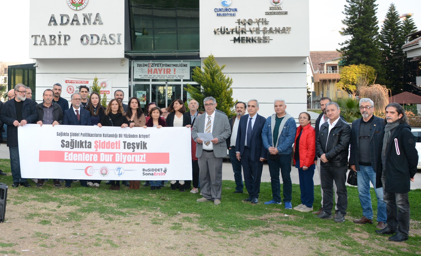 Adana Tabip Odası önünde bir araya gelen Adana Tabip Odası, Genel Sağlık İş Sendikası ile Sağlık ve Sosyal Hizmet Emekçileri Sendikası (SES) yönetici ve üyeleri AK Parti Kırklareli Milletvekili Ahmet Gökhan Sarıçam’ın “Memnuniyetsizlik varsa gidin sağlık personelinin gırtlağına yapışın” sözlerine tepki göstererek basın açıklaması yaptı.