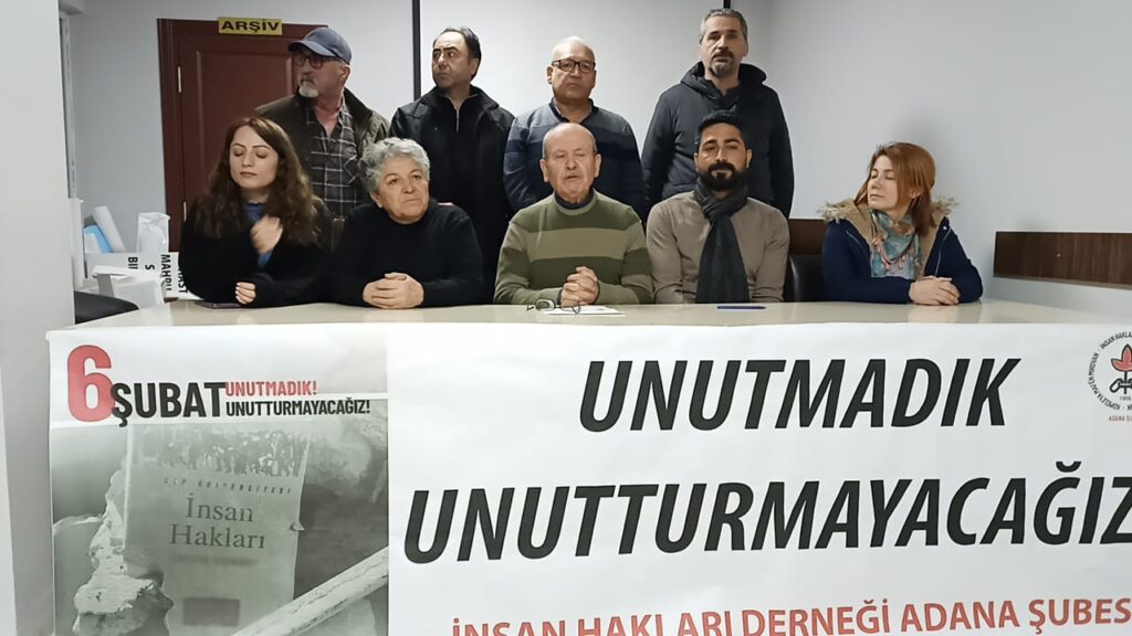 İHD Adana Şubesi dernek binalarında yaptıkları basın açıklamayla depremde yaşamını yitirenleri andı. Anmada konuşan İHD yöneticisi Yaşar Gökoğlu okudu. Depremin ikinci yılında hak ihlalleri ve mağduriyetlerin sürdüğünü ifade eden Gökoglu, depremin üzerinden iki yıl geçmesine rağmen, milyonlarca insanın hâlâ temel ihtiyaçlarını karşılamakta, barınmakta güçlük çektiğini belirterek, “Asgari yaşam şartlarından uzak, hijyenin sağlanamadığı, altyapısı yetersiz konteyner kentlerde, depremzedeler her gün yeniden mağdur oluyor.Yapımı planlanan kalıcı konut projelerinin büyük bir kısmı tamamlanmadı. Teslim edilen konutlar ise uluslararası standartlara uygun değil.Ayrıca kira yardımları yetersiz. Birçok aile, geçim sıkıntısı içinde. Depremden etkilenen bölgelerde sağlık ve eğitim hizmetlerindeki eksiklikler hala sürüyor.Sağlık tesislerinin büyük bir kısmı ya kullanılamaz hâlde ya da yetersiz.Büyük bir travma yaşanan bölge halkının psikolojik destek ihtiyacının karşılanmaması özellikle çocukları ve hassas grupları ciddi şekilde etkiledi.Öğrenciler konteyner sınıflarda eğitime devam etmek zorunda kalmıştır” dedi.