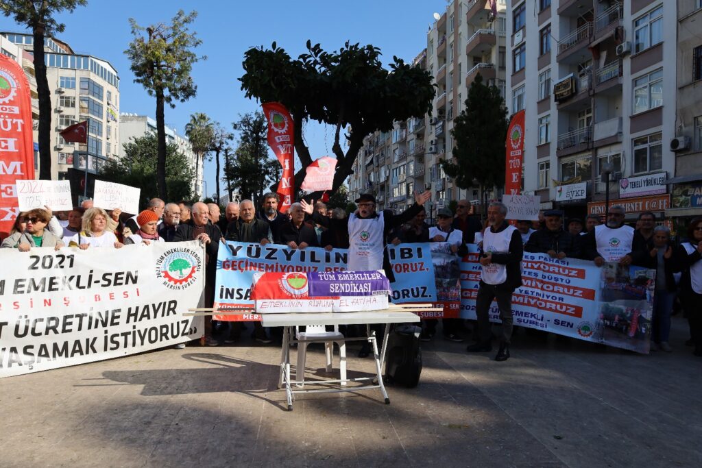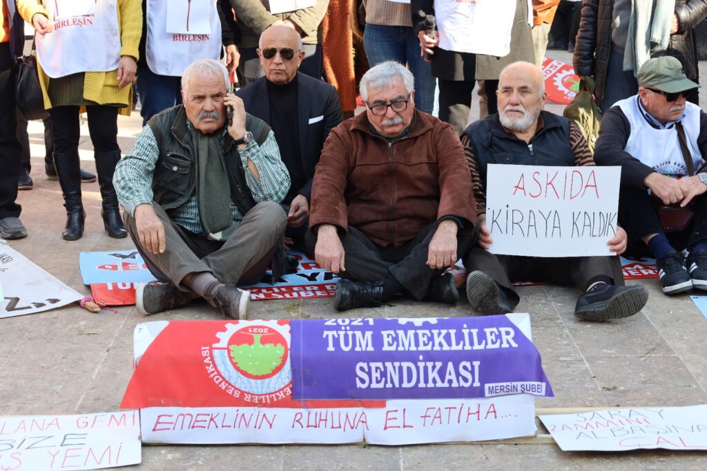 Mersin’de örgütlü emekli sendikaları, “Açlığa ve sefalete karşı insanca, onurlu bir yaşam” başlığıyla Özgür Çocuk Parkı’nda basın açıklaması gerçekleştirdi. “Kiralar ateş pahası, barınamıyoruz, hanemize ateş düştü, beslenemiyoruz” ve “Sefalet ücretine hayır, insanca yaşamak istiyoruz” pankartlarının açıldığı açıklamada sık sık, “TÜİK elini cebimizden çek” ve ‘Saraydan hesabı emekliler soracak” sloganları atıldı.