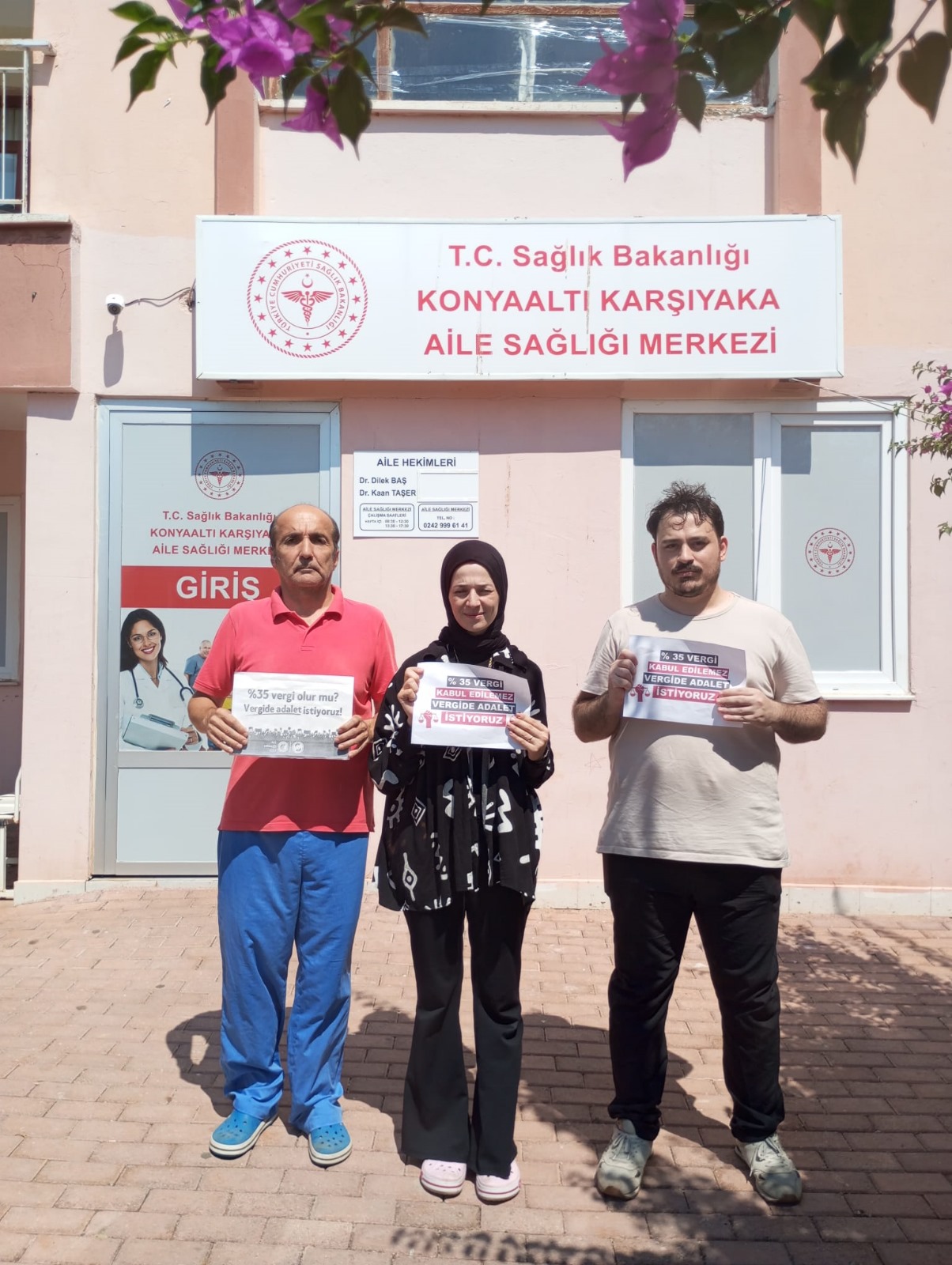 Sağlık ve Sosyal Hizmet Emekçileri (SES) Antalya Şubesi Eş Başkanı Dr. Kaan Taşer Karşıyaka Aile Sağlığı Merkezi önünde yaptığı “Vergide Adalet” adlı basın açıklamasında; AK Parti’nin uyguladığı ekonomik program sayesinde gerçek vergi rekortmenlerinin ücretli çalışanlar olduğunu belirtti.