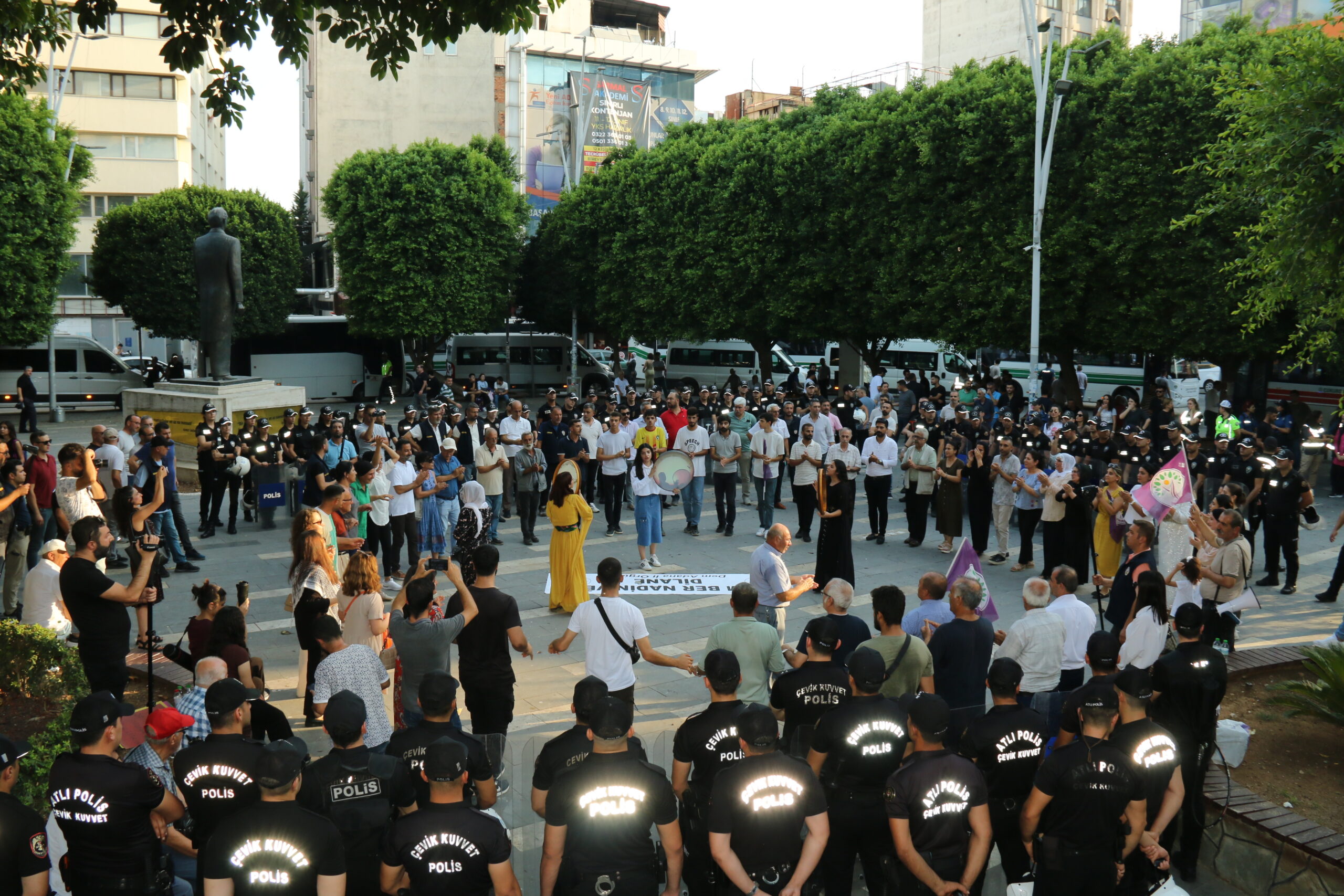 Adana İnönü Parkı’nda bir araya gelen DEM Partililer, Kürtçe şarkılar eşliğinde halay çekip “örgüt propagandasını yaptıkları” iddiasıyla tutuklananların durumunu halaylarla protesto etti.