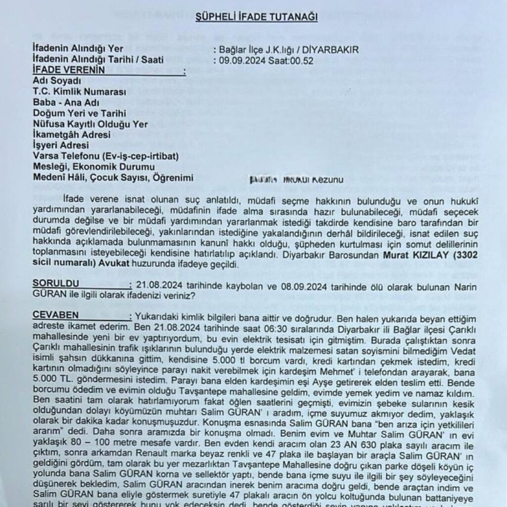 Narin Güran’ün ölümüyle ilgili itirafçı olan şahsın emniyetteki ifadesi ortaya çıktı. Gazeteci İbrahim Haskoloğlu’nun ulaştığı bilgilere göre itirafçının ifadesi şöyle:⠀“Muhtarın eviyle çok yakın oturuyorduk. Muhtarın (Narin’in Amcası) yoldan geldiğini gördüm. Sular sık sık kesilirdi onunla ilgili bir şey söyleyecek sandım.Muhtar aracından indi benim yanıma geldi. Daha sonra arabasına gittik ve ön koltuğunda bulunan battaniye içinde bir şeyi göstererek bunu yok edeceksin dedi.⠀İçinde bir insan olduğunu gördüm ve şaşırdım. Salim Gülhan (Muhtar) bana hitaben aileni iyi düşün sana 200 bin liradan fazla para veririm dedi.⠀Bu süreçte de etrafımızda kimse yoktu. Sonra bana aracında torba var mı? Dedi. Ben de aracın bagajından rengini hatırlamadığım bir çuval çıkartarak Salime verdim.⠀Battaniye sarılı çocuğu alıp çuvalın içerisinde birlikte koyduk. Bu esnada çocuğun üzerinde siyah şort vardı.