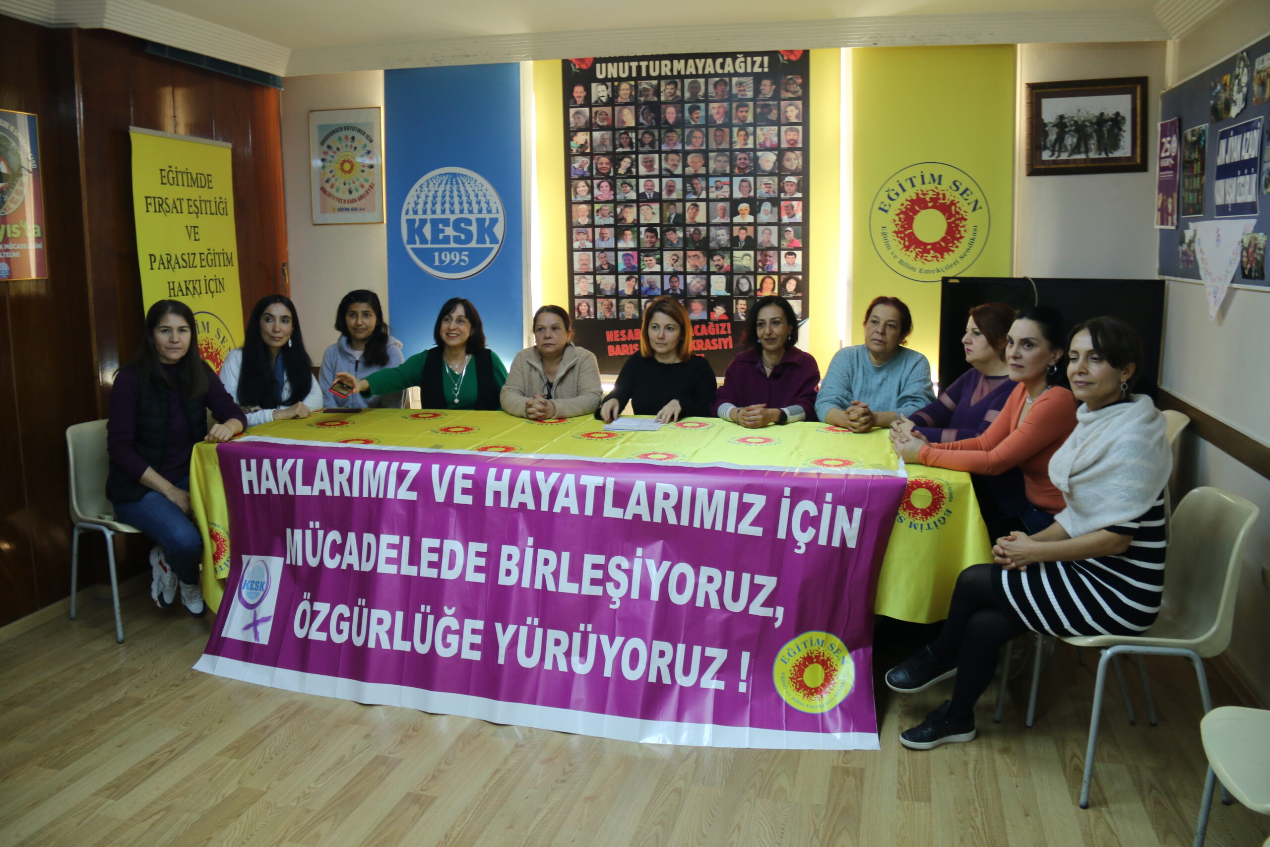 Kamu Emekçileri Sendikaları Konfederasyonu’un (KESK) Adana Kadın Meclisi, 8 Mart Dünya Kadınlar Günü’ne dair Eğitim Sen Adana Şubesi’nde basın toplantısı düzenledi. Çok sayıda kadının katıldığı açıklamada kadın meclisi adına konuşan Gülcan Aydın, “KESK’li kadınlar; tarikat ve cemaat karanlığını aklamaya çalışanlara, kamusal kurumları tarikat ve cemaatler arasında pay edip kamusal varlıkları bunlara peşkeş çekenlere Anayasayı defalarca çiğneyenlere, İstanbul sözleşmesini feshedip kadınları şiddet karşısında güvencesiz bırakıp şiddeti tırmandıranlara karşı bu 8 Mart’ta da yan yana ve alanlarda olacağız. Haklarımızdan, hayatlarımızdan, laiklikten vazgeçmeyiz. Buradayız, yan yanayız karanlığa karşı biz varız. Laikliği kazanacak ve bu gerici kadın düşmanı saldırıları durduracağız. Yaşamın her alanında; sömürüye, ayrımcılığa, cinsiyetçiliğe, savaşa, yoksulluğa, erkek şiddetine karşı direnmeye ve örgütlü mücadelemizi büyütmeye devam ediyoruz!” diye çağrıda bulundu.