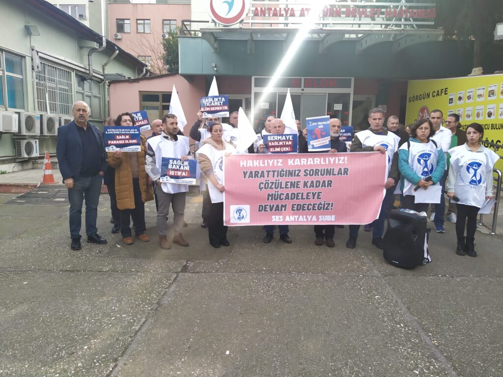 Aile Hekimlerinin ve Aile Sağlığı Merkezi Emekçilerinin 1’inci basamak iş kolunda “Aile Hekimliği Sözleşme ve Ödeme Yönetmeliğine” karşı başlattıkları 5 günlük iş bırakma eylemine 2’nci ve 3’ncü basamakta çalışan sağlık ve sosyal hizmet emekçileri de bugün 1 günlük iş bırakarak destek veriyorlar. İş bırakma eylemi nedeniyle Sağlık ve Sosyal Hizmet Emekçileri Sendikası (SES) Antalya Şubesinin çağrısıyla Atatürk Devlet Hastanesi önünde basın açıklaması yapıldı. Basın açıklamasını SES Antalya Şube Eşbaşkanı Şükran İçöz okudu. Taleplerini sıralayıp yönetmeliğin geri çekilmesini isteyen Şükran İçöz, “Haklıyız, kararlıyız! Yarattığınız sorunlar çözülene kadar mücadeleye devam edeceğiz” dedi.