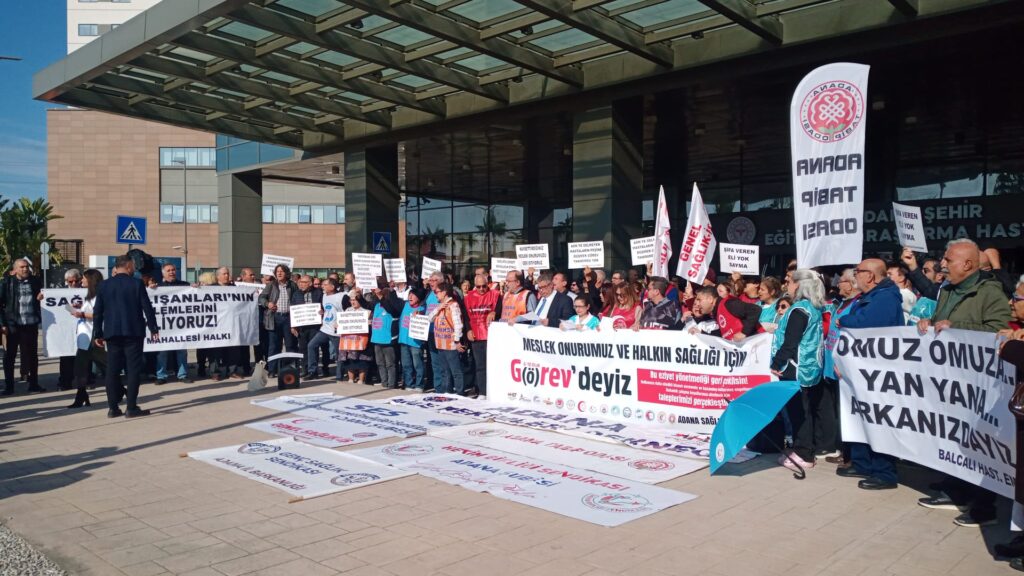 Sağlıklı bir toplum ve iyi çalışan bir sağlık sistemi için ülke genelinde 6 Ocakta iş bırakan ASM çalışanlarına ek olarak bugün 2 ve 3’ncü basamakta görevli hekim ve sağlık emekçileri de iş bıraktı. Adana Şehir Hastanesi Başhekimlik binası önünde toplanan Adana Sağlık Platformu üyeleri adına basın açıklamasını okuyan Adana Tabip Odası Başkanı (ATO) ve Platform Sözcüsü Uzm. Dr. Özden Polatöz, taleplerini sıralayarak, “Aile Hekimliği Sözleşme ve Ödeme Yönetmeliğinin” geri çekilmesini istediler.