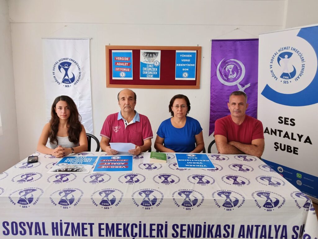 Sağlık ve Sosyal Hizmet Emekçileri Sendikası (SES) Antalya Şubesi, “Vergide Adalet” talebiyle şubelerinde açıklamada yaptı. Açıklamada konuşan SES Antalya Şubesi Eşbaşkanı Dr. Kaan Taşer, “Vergi kesintileri sağlık emekçileri için soyguna dönüştü! mücadele etmekten başka çaremiz kalmadı. Emeğiyle geçinmeye çalışan, enflasyonun ve ekonomik krizin yükü altında ezilen tüm ücretliler, sabit gelirliler için vergide ve gelirde adalet istiyoruz” dedi.