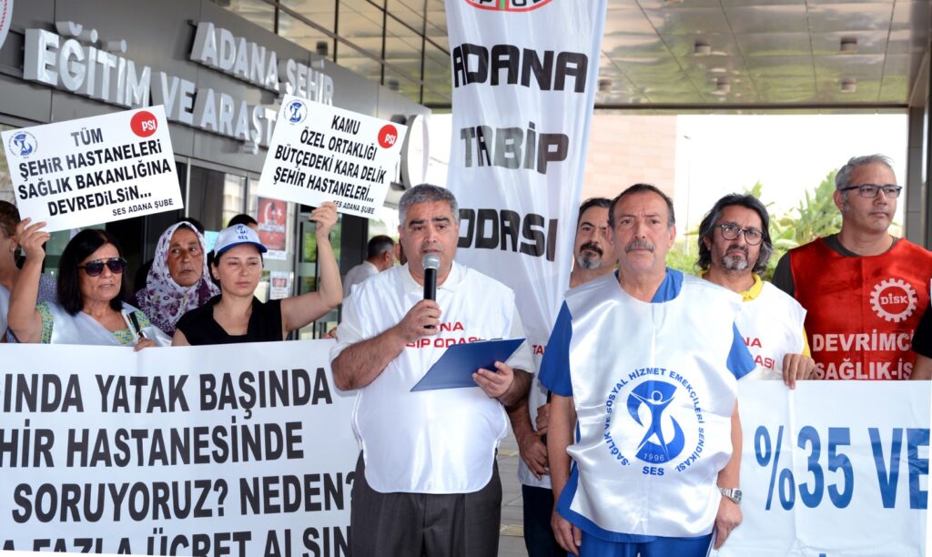 Adana Şehir Hastanesi’nin açılışının yedinci yıldönümüne ilişkin bir açıklamada yapıldı. Basın metnini okuyan SES Adana Şube Eşbaşkanı Erol Eren, Şehir Hastanelerinin “toplumun ortak yaşamını talan eden bir yapı” olduğunu savundu. Eren, “Şehir hastanelerine karşı mücadelemiz basit bir karşı çıkış değil, toplumsal sağlık krizine çözüm arayan bir yeniden inşa mücadelesidir. Halkın sağlık hakkı için verdiğimiz bu mücadeleyi kararlılıkla sürdüreceğimizden kimsenin kuşkusu olmasın” dedi.