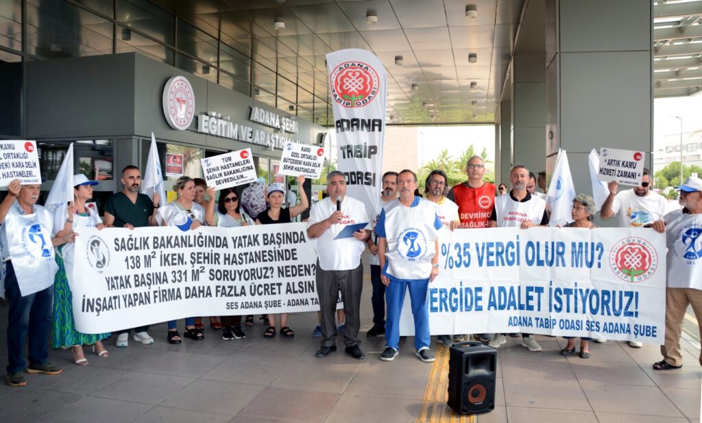 Adana Tabip Odası (ATO) ve Sağlık ve Sosyal Hizmet Emekçileri Sendikası (SES) Adana Şubesi yönetici ve üyeleri, “Vergide Adalet” talebiyle Adana Şehir Hastanesi Başhekimlik Binası önünde bir araya gelip basın açıklaması gerçekleştirdi. Basın açıklamasını okuyan Adana Tabip Odası Başkanı Uzm. Dr. Özden Polatöz, 15 Eylül’de aldıkları ücretin, yapılan enflasyon farkı artışına rağmen bu yılın ocak ayında aldıkları ücretin altında kaldığını söyledi.
