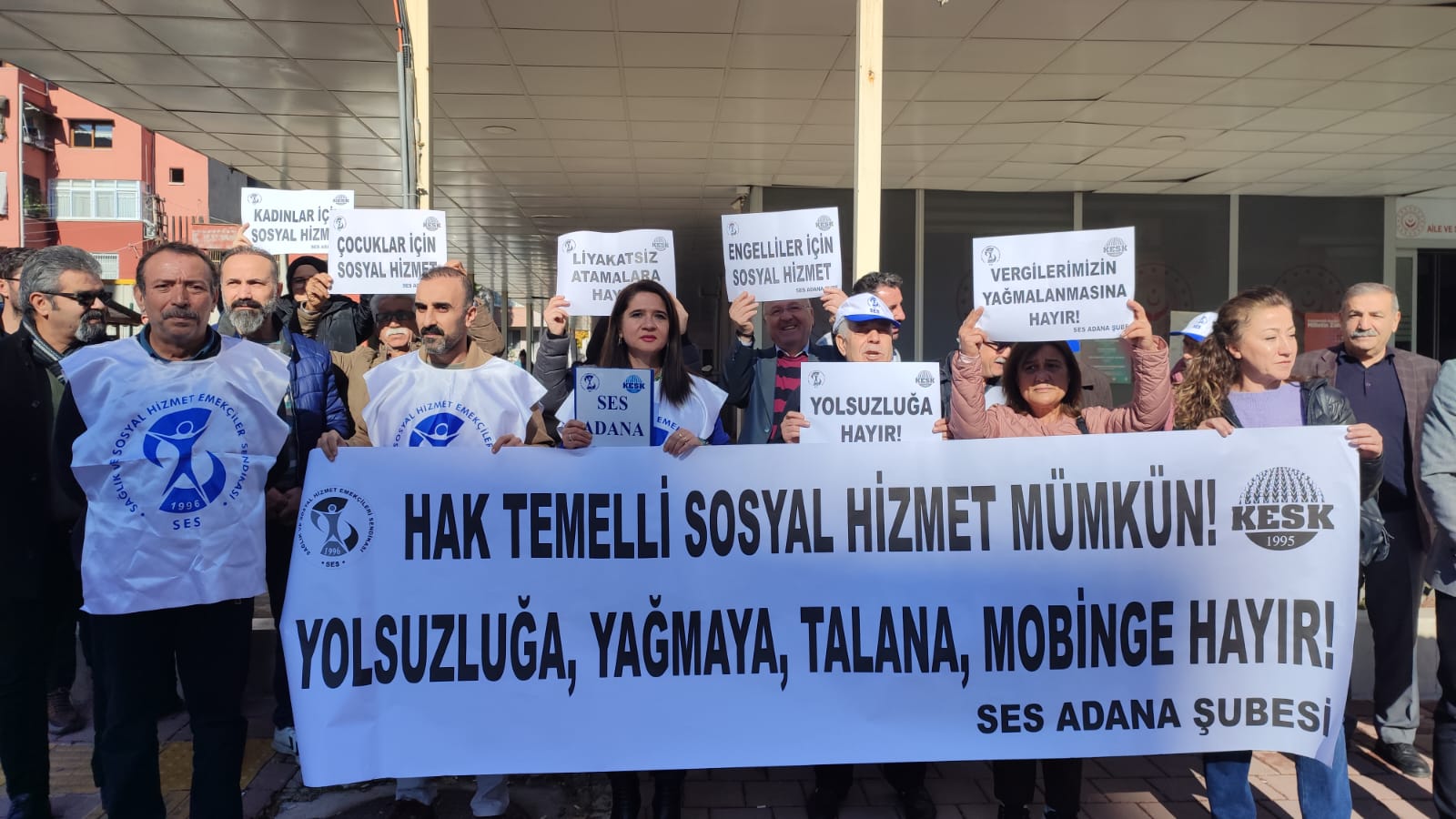 Sağlık ve Sosyal Hizmet Emekçileri Sendikası (SES) Adana Şubesi, “Liyakatsiz atamalarla göreve gelen yöneticilerin baskı ve mobbingine, yolsuzluğa, yağmaya ve talana hayır” sloganı ile Aile ve Sosyal Hizmetler İl Müdürlüğü önünde basın açıklaması gerçekleştirdi. Açıklamada ortak basın metnini okuyan SES Adana Şubesi Eşbaşkanı Şükran Güzel, Aile ve Sosyal Hizmetler İl Müdürlüğü’ndeki baskı, mobbing, yolsuzluk, yağmaya ve uyuşturucuya değindi.