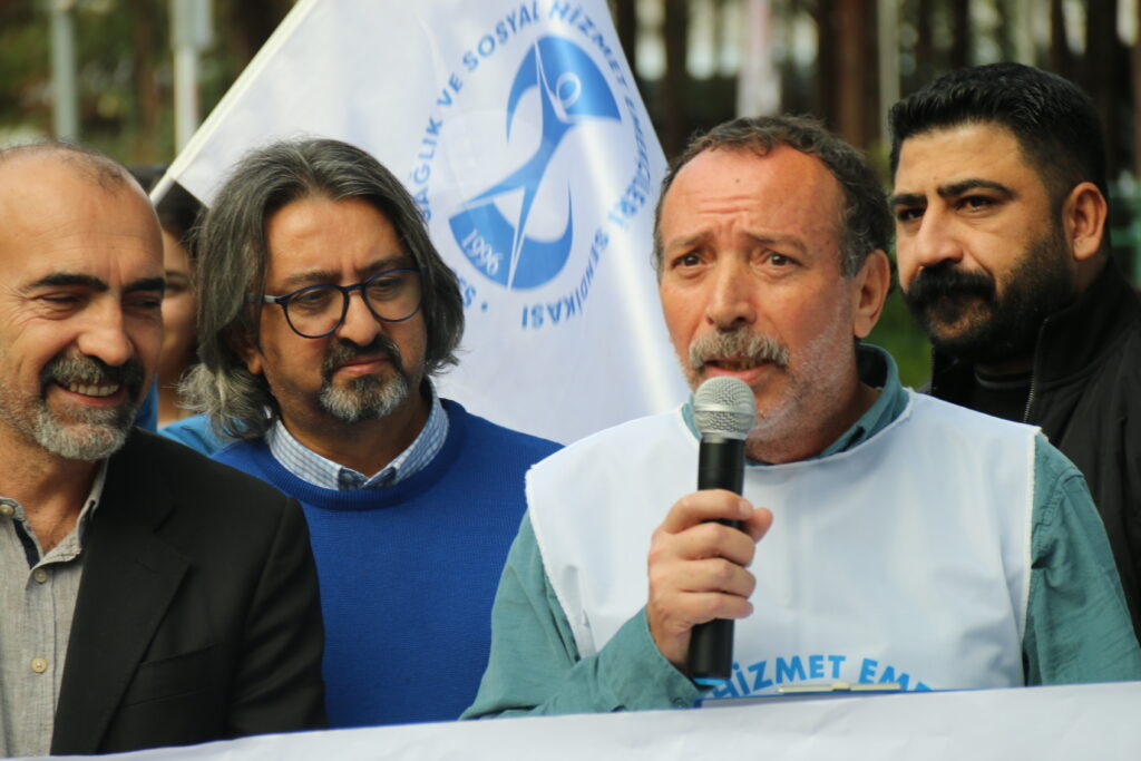 Açıklamada ortak basın metnini okuyan SES Adana Şube Başkanı Erol Eren, emekçilerin haklarını savunmayan, üyelerine adaletsiz uygulamalarla baskı yapan sendikaları eleştirerek, emekçilerin hukuki hakları savunacaklarını ve sağlık emekçilerinin sonuna kadar yanında olacaklarını vurguladı. Eren, “İnsanca yaşamaya yetecek bir ücret, adil bir vergi sistemi, halk için, emek için bütçe güvenceli, iş güvenceli gelecek için omuz omuza verelim. Emekten yana bir bütçe için uğraşırken bizler toplu sözleşme masalarında bizleri mağdur eden haklarımızı savunmayan emekçileri sermayeye peşkeş çeken sendikalar basit hesaplar peşinde koşup üyelerimize baskı kurmakta yer değişikliği, servis değişikliği gibi adil olmayan uygulamalarla tehdit etmekte uygulamakta ve beraber örgütlenme çalışmasına çıkmaktadırlar. Emeğin ve emekçinin hakkını savunmayı bilmeyen sendikacılığın nasıl yapıldığından habersiz olan sari sendikanın literatürümüze astın üste mobbingi gibi bir kelime kattığı için de şaşkınlık içindeyiz” diye konuştu.