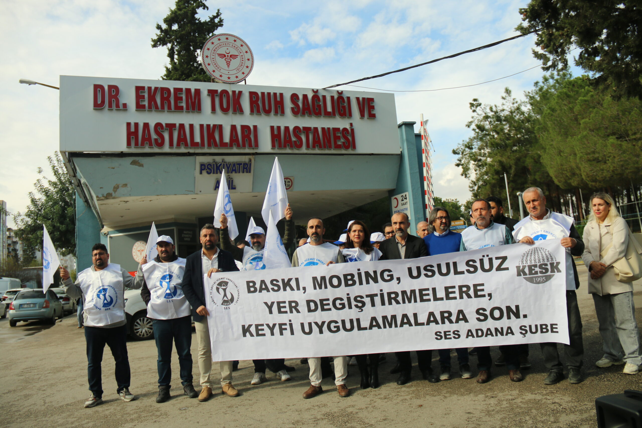 Sağlık ve Sosyal Hizmet Emekçileri Sendikası (SES) Adana Şubesi, Dr. Ekrem Tok Ruh Sağlığı ve Hastalıkları Hastanesi’nde çalışanlara dönük baskı ve mobbing basın açıklaması ile protesto edildi. Hastane önünde yapılan açıklamaya çok sayıda sağlık emekçisinin yanı sıra SES Eş Genel Başkanı Sıddık Mehmet Akın da katılım sağladı.