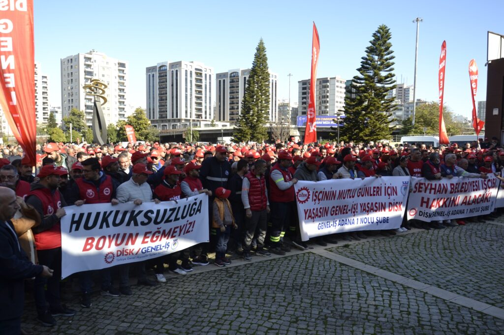 Seyhan Belediyesi, Genel-İş Sendikası ile imzaladığı Toplu İş Sözleşmesi’ni (TİS) hedef alan bir dava açarak, işçilerin kazandığı hakları geriletmek için harekete geçti.1 Ocak 2024’de başlayarak, 31 Aralık 2025’e dek süren TİS’e göre 1 Ocak 2025 tarihi itibariyle TÜFE değişim oranı + 10 puan refah payı oranında, ücret zammı yapılacak. Belediye 2025 zammına karşı dava açtı. DİSK Genel-İş Adana 1 Nolu Şube ve DİSK Bölge Temsilciliği, Seyhan Belediyesi’nin bu girişimine karşı belediye binası önünde bir basın açıklaması düzenledi. Yüzlerce işçi, belediye yönetiminin tehditlerine rağmen katıldı ve “İşçiler hakkını alacak”, “İnsanca yaşamak istiyoruz”, “İş, ekmek, özgürlük” sloganlarıyla tepkilerini dile getirdi.
