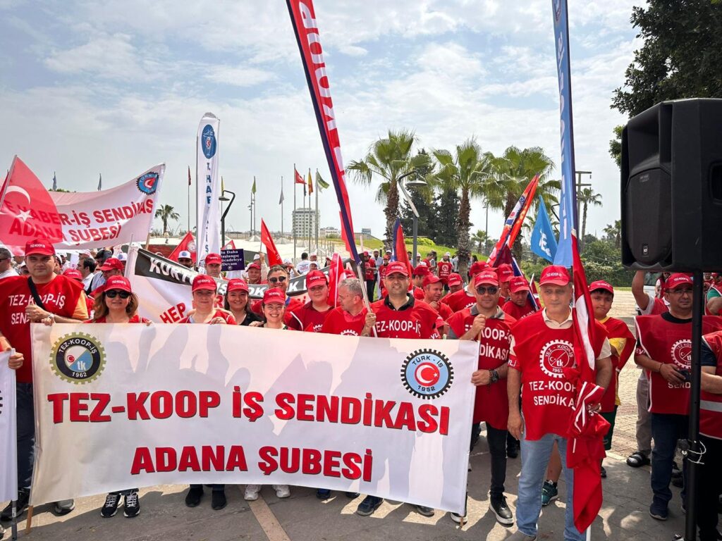 1 Mayıs Emek ve Dayanışma Günü’nü Türkiye’nin birçok şehrinde, örgütlenmeden gelen güçle binlerce emekçinin katılımı ile coşkuyla kutlayacaklarını ifade eden Tez Koop-İş Sendikası Adana Şube Başkanı Mustafa Oğuz, sözlerini şöyle sürdürdü:“1 Mayıs, İşçilerin, emekçilerin tüm yıl boyunca ekonomik, demokratik ve sosyal hakları için mücadele ettiği ve bu mücadeleyi farklı işkollarından, farklı mesleklerden, farklı işlerden alanlara gelen sınıf kardeşleriyle ortaklaştırdığı gündür.