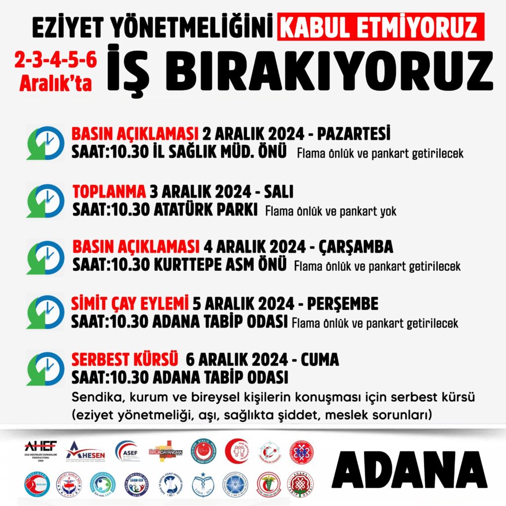 Adana Tabip Odası, Aile Hekimleri Dernekleri Federasyonu (AHEF), Aile Hekimliği Çalışanları Sendikası (AHESEN), Aile Sağlığı Çalışanları Ebe ve Hemşire Dernekleri Federasyonu (ASEF), Birinci Basamak Sağlık Çalışanları Birlik ve Dayanışma Sendikası, Birlik Sağlık ve Sosyal Hizmet Çalışanları Sendikası, Genel Sağlık İş, Hekim Birliği Sendikası, Hekim Sen, Hürriyetçi Sağlık Sen, Sağlık Çalışanlarına Hak Ve Mücadele Derneği (SAHADER), Sağlık Hizmetleri Sendikası (SAHİMSEN), Sağlık ve Sosyal Hizmet Emekçileri Sendikası (SES), Tabip Sen, Tüm Radyoloji Teknisyenleri ve Teknikerleri Derneği (TÜMRAD-DER), Türk Tabipleri Birliği (TTB) ile Türkiye Aile Hekimleri Uzmanlık Derneği (TAHUD)’dan oluşan Adana Sağlık Platformu; ortak karar alarak 2-6 Aralık tarihlerinde  Aile Hekimlerinin çalışmayarak iş bırakacağını duyurdu.